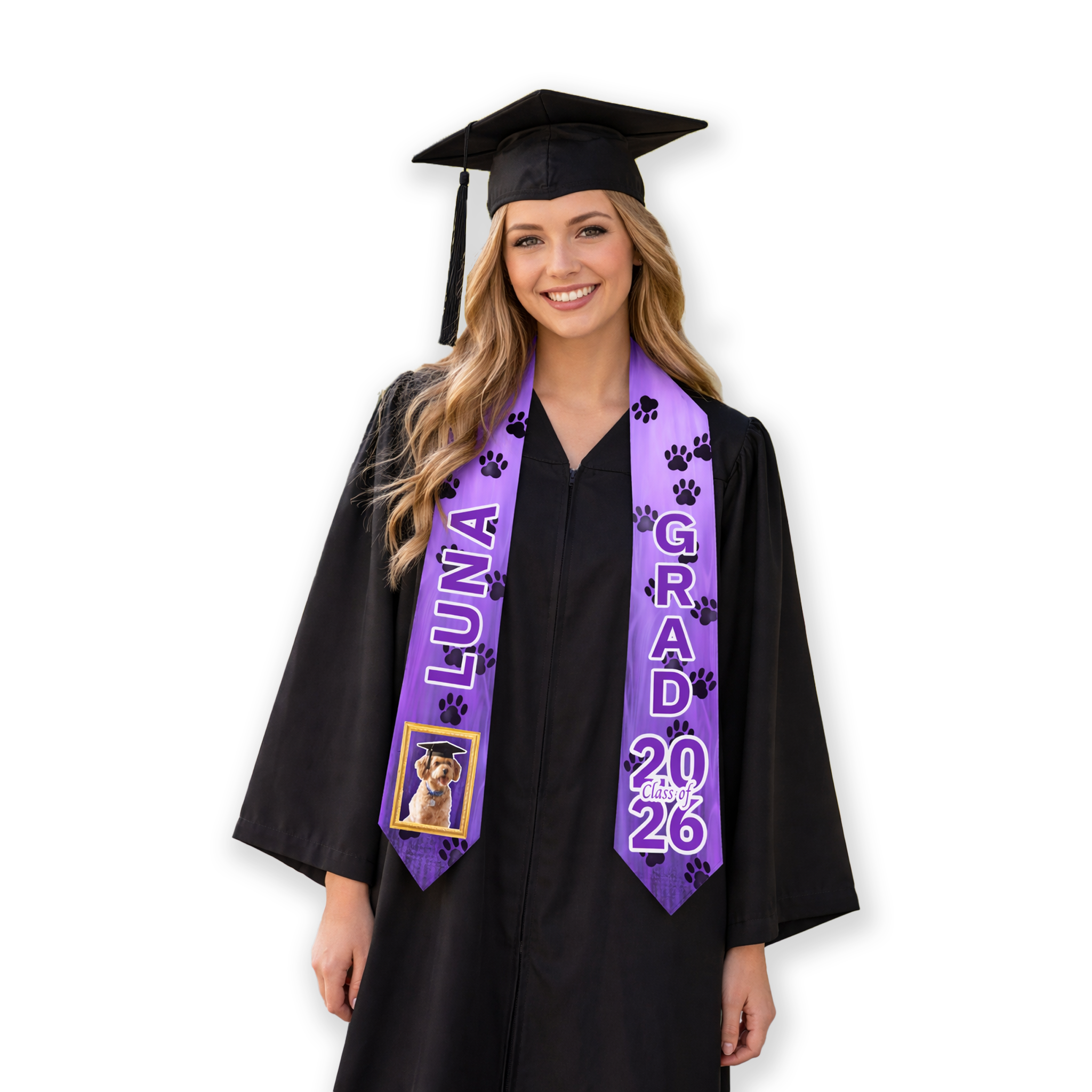 This custom print-on-demand graduation stole is crafted with a premium double-layer construction for a polished, high-quality look and feel. The fabric is professionally overlocked to securely bind both layers together, with sublimated thread colors carefully matched to your design for a seamless, finished appearance. Each stole includes double-sided sublimation at no additional cost, allowing your custom design to be visible on both sides with vibrant, long-lasting color. Designed for comfort, durability, and standout style, this custom graduation stole is made to celebrate your achievement in a truly personalized way.